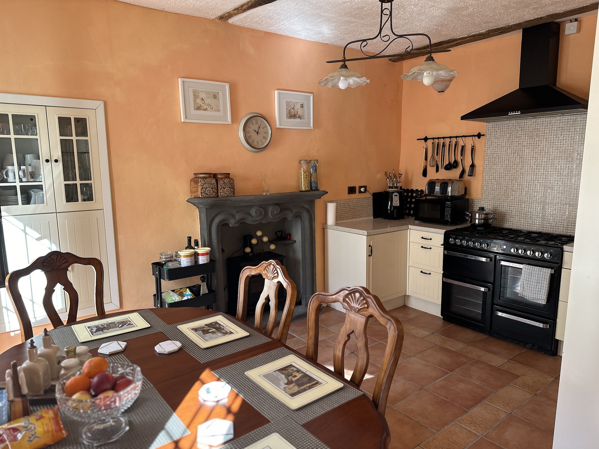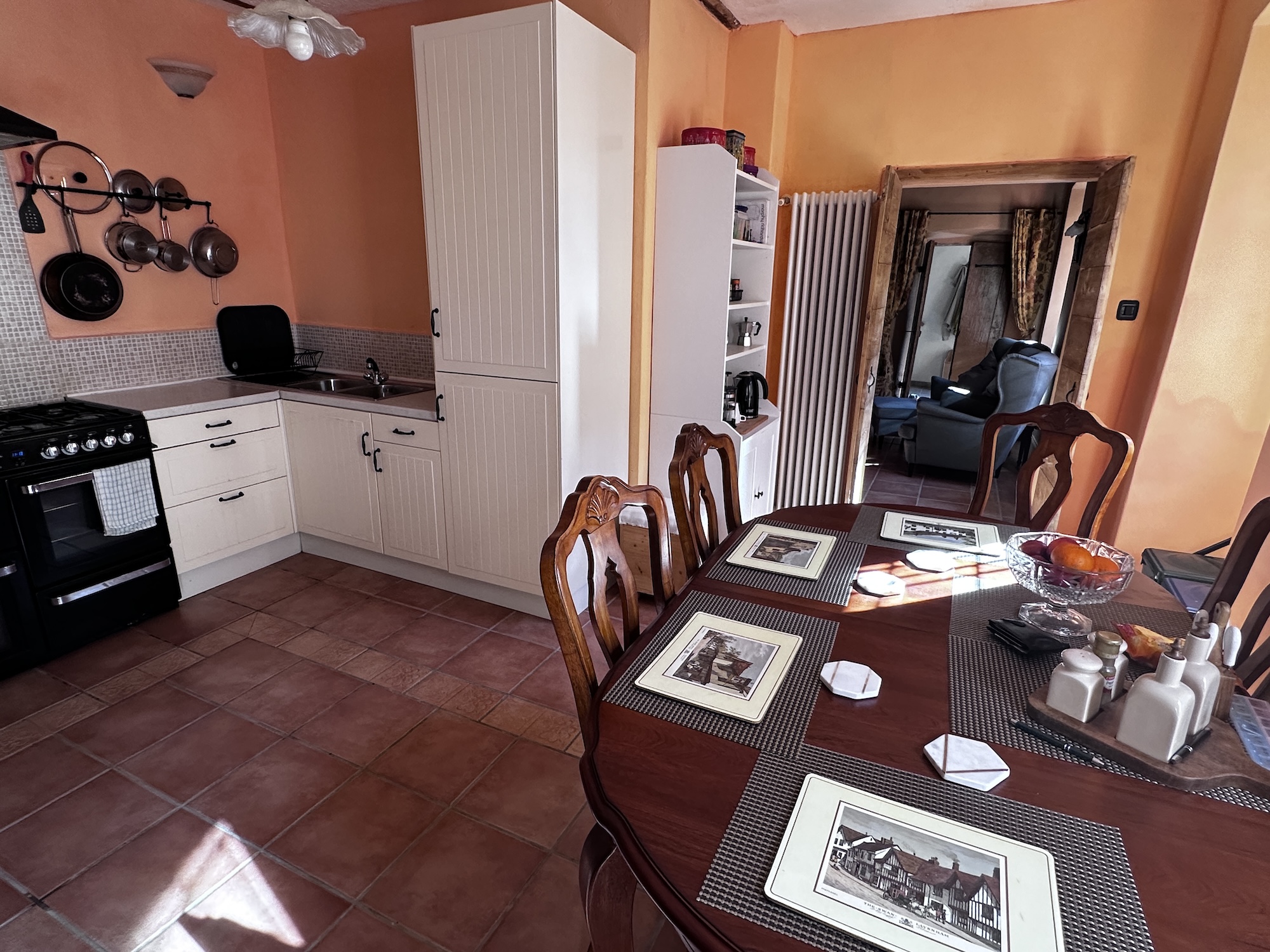 ERDGESCHOSS: geräumiges Wohnzimmer mit Kamin, kleiner Hauswirtschaftsraum mit Waschmaschine und Regalen, Wohnküche mit eingebauten Schränken, Doppelbackofen und 8-Flammen-Kochfeld. Dunstabzugshaube sowie integriertem Kühl-/Gefrierschrank. Gäste-WC im Erdgeschoss und Ausgang zum Innenhof.