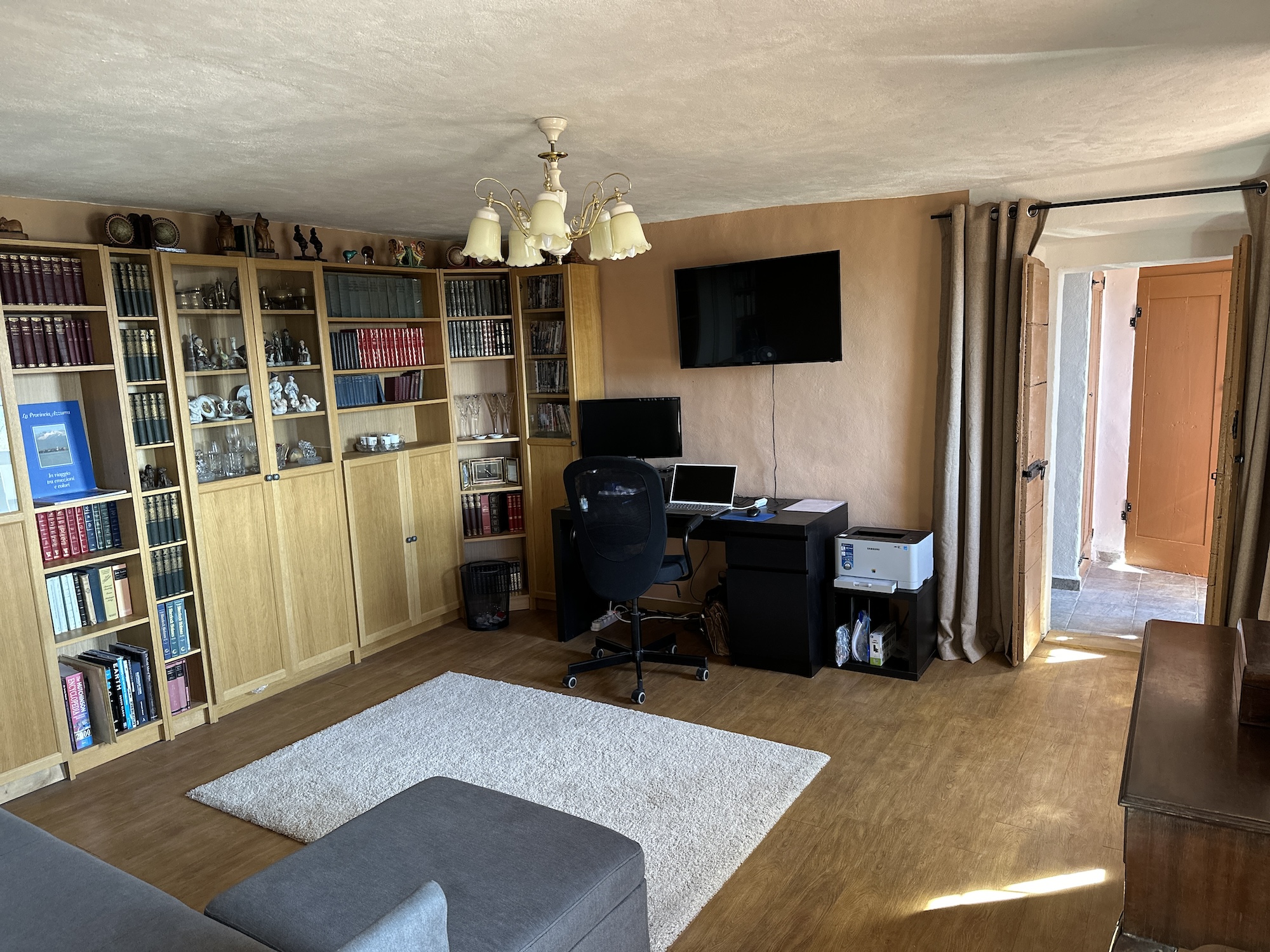 2. STOCK: Arbeitszimmer mit Balkon, ausgestattet mit Schlafsofa, Einbauschränken und Regalen sowie ein weiteres Zimmer, noch zum fertigstellen. Ausgang zum Balkon mit Blick über die Wiese und den See.